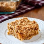 Pour the mixture evenly into your prepared baking dish. Bake for 40 to 45 minutes, or until the center is set and a toothpick inserted comes out mostly clean. Let it cool for 5-10 minutes before slicing — this helps the oatmeal set up nicely so it holds together.