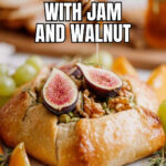 A delightful appetizer featuring a creamy wheel of brie wrapped in flaky puff pastry, topped with sweet fig jam and crunchy walnuts, baked until golden brown and served warm with fruits, crackers, or crostini.