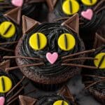 Delightfully spooky Black Cat Cookies made from Devil’s Food cake mix, topped with rich black cocoa frosting and decorated with candy eyes, heart-shaped noses, licorice whiskers, and chocolate ears. Perfect for Halloween or any fun occasion, these soft, chocolaty cookies combine easy baking with creative decorating.