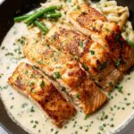 This delicious Boursin Salmon recipe features fresh salmon fillets cooked in a creamy garlic and herb Boursin cheese sauce, enhanced with sautéed onions, lemon juice, and fresh parsley. Perfectly seared to retain moisture and finished in a rich sauce, this dish is both elegant and easy to prepare for a satisfying dinner.