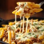 A creamy, cheesy penne pasta dish combined with savory garlic butter ground beef, perfect for a comforting and flavorful dinner.