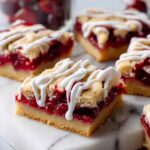 Delicious cherry pie bars featuring a buttery crust topped with sweet cherry pie filling and a smooth almond vanilla glaze, perfect for dessert or snacking.