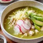 Ladle your Chicken Pozole Verde Soup Recipe into bowls and load up on toppings—radishes, avocado, a squeeze of lime, fresh cilantro, cabbage for crunch, and a few tortilla chips for that festive vibe.