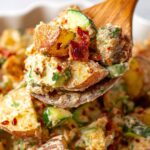 This Chili Crisp Smashed Potato Salad is a flavorful twist on a classic potato salad, featuring crispy roasted smashed Yukon Gold potatoes tossed in a creamy, tangy, and spicy dressing made with mayo, sour cream, lime, and chili crunch. Enhanced with fresh herbs, scallions, cucumbers, and optional bacon, this dish is perfect for gatherings and offers a delightful balance of textures and flavors.