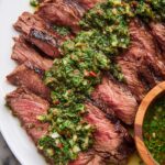 - Slice and Serve: Slice the rested steak into ½-inch slices against the grain. Arrange on a serving platter, then top and serve with fresh chimichurri sauce. Optionally serve additional chimichurri on the side.