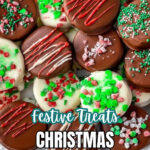 Delight in festive Christmas Chocolate Covered Oreos dipped in smooth milk and optional white chocolate, decorated with vibrant holiday sprinkles and colorful drizzles for a stunning holiday treat.