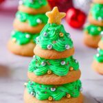 Create festive Stacked Christmas Tree Cookies featuring buttery sugar cookies layered with creamy green buttercream frosting and decorated with star sprinkles and pearl-shaped sprinkles. Perfect for holiday celebrations and gifting.
