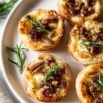 Delightful Cranberry Brie Bites with flaky puff pastry, creamy brie cheese, tangy cranberry sauce, and crunchy pecans. Perfect as an elegant appetizer or party snack, garnished with fresh rosemary and a touch of sea salt for a burst of flavor.
