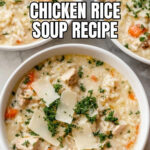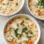 A comforting and creamy chicken and rice soup made with tender seasoned chicken thighs, fresh vegetables, herbs, and a creamy broth thickened with rice and flour. This hearty soup is perfect for a warming meal and garnished with Parmesan, black pepper, and fresh parsley.