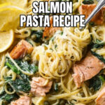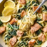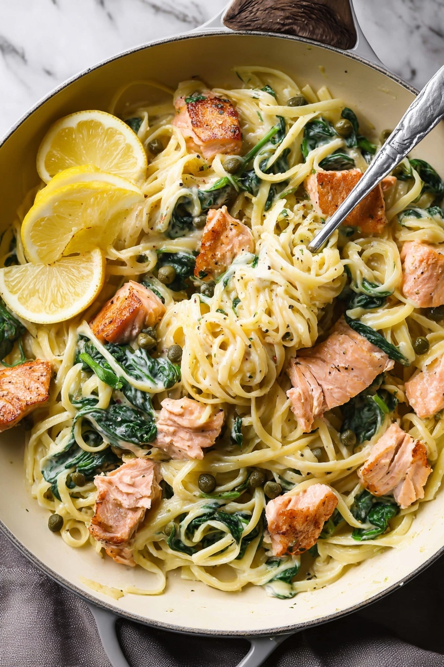 A rich and creamy salmon pasta recipe featuring baked salmon, tender linguine, and a luscious sauce made with heavy cream, white wine, garlic, and spinach. This comforting dish is perfect for a satisfying dinner and garnished with capers and lemon wedges for a bright finish.