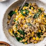 I’ve frozen portions of this creamy sausage orzo before with good results. Just freeze in meal-sized containers, leaving a little space for expansion. When thawing, do it overnight in the fridge for best texture, then gently reheat on the stove with a bit of liquid added back in to loosen it.