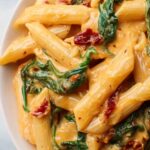 A creamy and flavorful one-pot spinach tomato pasta recipe featuring a rich tomato and cream sauce, fresh spinach, sun-dried tomatoes, and parmesan cheese, all cooked together for an easy, delicious meal.