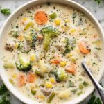 This creamy vegetable soup is a wholesome and comforting dish packed with a medley of fresh and frozen vegetables simmered in a rich, velvety broth. Perfect for a cozy meal, it combines flavors of thyme and oregano with the natural sweetness of carrots, corn, and green beans, thickened with a classic roux made from butter and flour and enriched with whole milk.