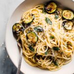 - Toss Pasta and Zucchini: Transfer the cooked pasta to a large skillet over medium-low heat. Add the zucchini mixture and gradually pour in the reserved pasta water as needed, tossing continuously until the sauce achieves a creamy consistency.