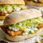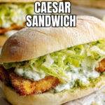 Chicken Caesar Sandwiches feature crispy fried chicken cutlets layered with creamy garlic butter and homemade Caesar dressing on toasted hoagie rolls, combined with fresh romaine lettuce and Parmesan cheese for a delicious and satisfying meal.