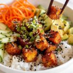 Once the tofu has cooled slightly, toss it with half of the sauce so every piece gets lovingly coated. Save the rest of the sauce for dipping or drizzling. I like to serve mine with steamed rice, crunchy cucumber slices, ribbons of carrot, creamy avocado, and a sprinkle of toasted sesame seeds—it’s like a bite of Korean comfort food heaven.