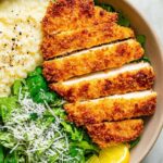- For extra crispiness, press the panko and parmesan firmly onto the chicken before frying.