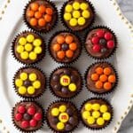 Delightful Fall Daisy Mini Cupcakes featuring rich chocolate cupcakes topped with creamy chocolate buttercream and decorated with colorful M&M’s arranged like daisies for a festive autumn treat.