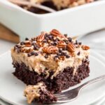 This delicious German Chocolate Poke Cake is a moist chocolate cake filled with a luscious sweetened condensed milk and hot fudge sauce mixture, topped with creamy coconut pecan frosting, chopped pecans, and mini chocolate chips. Perfect for dessert lovers who enjoy a rich and indulgent treat.