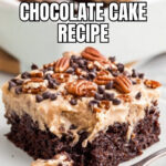 - Add toppings and serve: Sprinkle the chopped pecans and mini chocolate chips evenly over the frosted cake. Slice into pieces and serve.