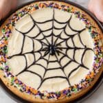 This Giant Halloween Spider Cookie is a fun and festive treat perfect for spooky celebrations. Made with rich chocolate chip cookie dough, topped with creamy vanilla frosting and decorated with sprinkles and black icing to create a spider web design, this cookie is sure to delight kids and adults alike.