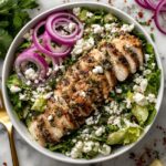 - Assemble the bowls: Distribute the cooked rice or quinoa into bowls. Layer with shredded lettuce, tomatoes, cucumber, red onion, sliced chicken, and sprinkle with feta cheese. Add a generous dollop of tzatziki sauce. Optionally, drizzle olive oil and lemon juice or lemon tahini dressing on top for extra flavor.