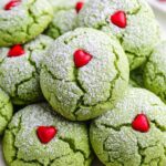 These festive Grinch Cookies are soft, chewy, and bursting with peppermint flavor, perfect for holiday celebrations. Made with white cake mix and a blend of peppermint and vanilla extracts, they are vibrantly green and topped with heart-shaped sprinkles for a fun and colorful treat.