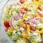 A fresh and flavorful Grinder Salad featuring a zesty homemade dressing combined with crunchy iceberg lettuce, tangy pepperoncini, and a mix of savory deli meats and cheese, perfect for a quick and satisfying meal.
