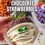- Make Mummy Strawberries: Melt ½ cup white chocolate in 20-second increments until smooth. Place a tablespoon of this melted chocolate into a piping bag. Insert two toothpicks into the top of each strawberry, dip into white chocolate and place on baking sheet. Chill in the fridge for 10 minutes or freezer for 5 minutes to set. Remove chilled strawberries and use reserved dark chocolate to paint a small rectangle on the upper third of each strawberry, then place two small green circular sprinkles as eyes. Use the piping bag to pipe bandages randomly over the strawberry. Allow to fully set.