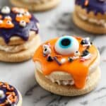 The image shows small round treats with two beige biscuit layers. Between the layers is a thin layer of white cream. The top biscuit is decorated with a thick layer of bright orange icing that drips a little down the sides. On top of the icing is a large edible eye with a white base and a black pupil in the center. Around the eye are sprinkles in black, white, purple, and orange shapes, some shaped like bats or ghosts. Other similar treats with different colored icing, like deep purple with orange and white decorations, appear slightly out of focus in the background on a white marbled surface. Photo taken with an iphone --ar 4:5 --v 7