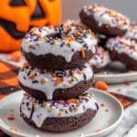 While your donuts cool, whisk together confectioner’s sugar and milk for the glaze until smooth and thick but still dippable. Dip the tops of your donuts carefully, then immediately sprinkle on the Halloween sprinkles before the glaze sets. Watching those colors pop on the rich chocolate is seriously satisfying!