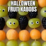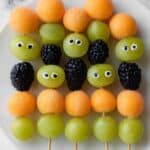 Halloween Fruit Kabobs are a fun and festive way to serve fresh fruit with a spooky twist. Featuring cantaloupe, blackberries, green grapes, and candy eyeballs, these colorful kabobs are perfect for Halloween parties or a healthy snack that kids will love.