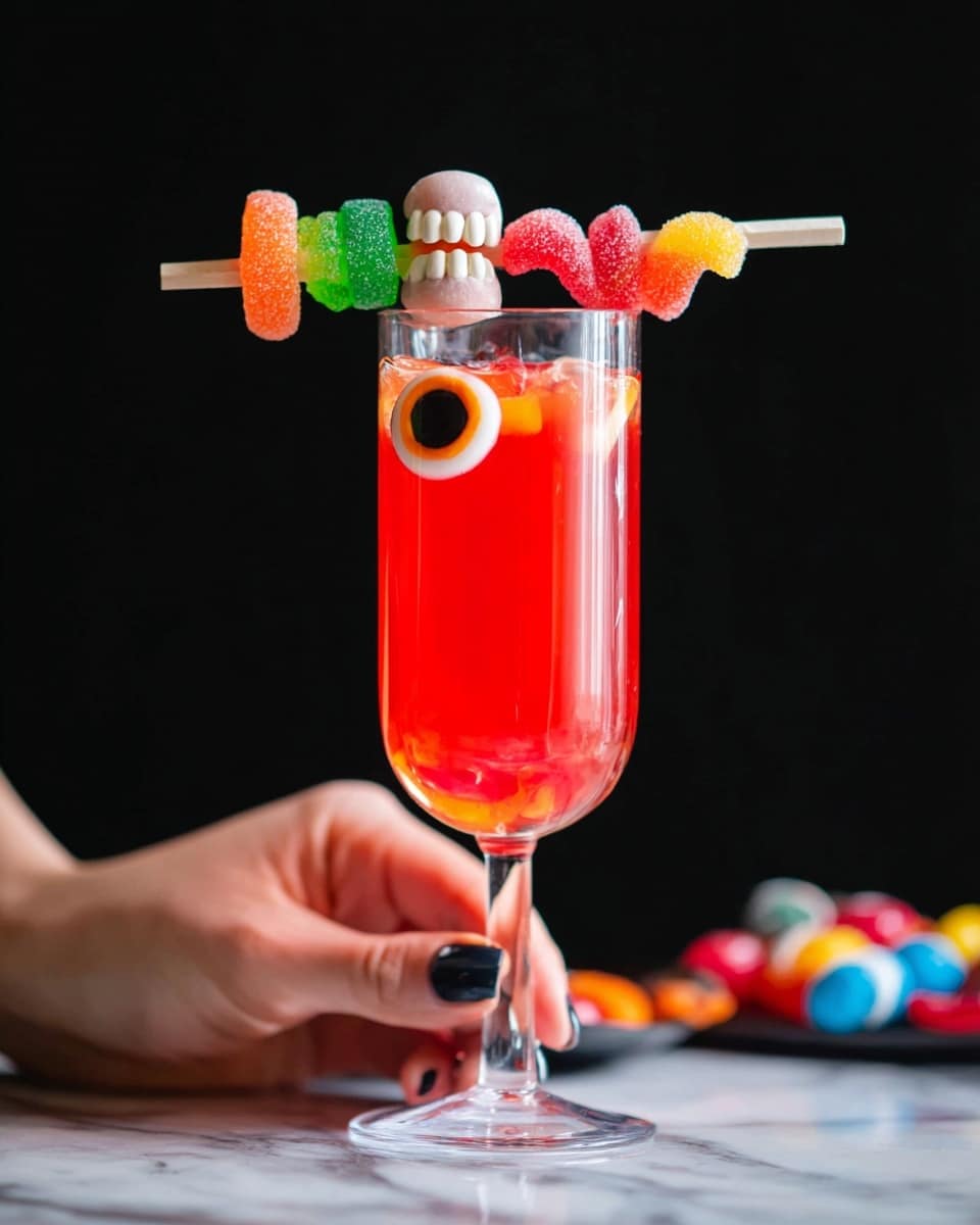 • Gummy eyeballs, vampire teeth, worms: These fun garnishes dial up the creep factor and are great conversation starters.