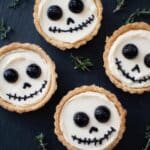 This Halloween Jack Skellington Ricotta Olive Tart recipe features a gluten-free tart crust filled with a creamy ricotta and Greek yogurt mixture, topped with black olives and sun-dried tomatoes arranged to create a spooky Jack Skellington face. Perfect as a festive appetizer or snack for Halloween gatherings, these mini tarts combine savory flavors with a creative, seasonal presentation.