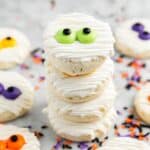 One of my favorite presentation tricks is arranging the cookies on a black platter with faux spider webs and small plastic spiders scattered around. I’ve also wrapped a few mummies individually in clear cellophane and tied them with orange ribbon for easy party favors. Kids go nuts for those!