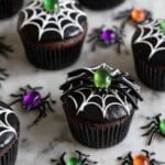 These Halloween Spider Cupcakes are a spooky and fun treat featuring rich chocolate cupcakes topped with black chocolate frosting decorated like spiderwebs and finished with playful toy spider rings. Perfect for Halloween parties and festive gatherings.