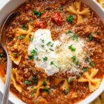 This comforting and hearty Lasagna Soup combines all the delicious flavors of traditional lasagna in a warm, easy-to-make soup form. Featuring ground beef, a medley of tomato products, Italian seasonings, and bowtie pasta, it’s perfect for a cozy family meal. Topped with ricotta, mozzarella, parmesan, and fresh parsley, this soup is a delicious and satisfying twist on an Italian classic.