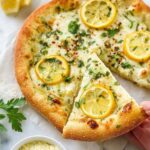 This fresh and zesty Lemon Pizza recipe combines a tender, easy no-knead pizza dough with a bright lemon brine, creamy mozzarella, and finishing touches of parmesan and fresh herbs. Perfect for a light and flavorful meal, this pizza offers a delightful balance of citrus and cheese with a crispy crust baked on a pizza stone or inverted baking sheet.