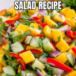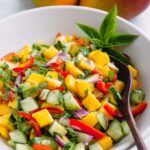 A refreshing and vibrant mango salad featuring ripe mangoes, crisp bell pepper, cucumber, and a zesty homemade dressing with lemon juice, honey, and ginger. Perfect as a light side dish or appetizer, this salad combines sweet, tangy, and spicy flavors with fresh basil for an aromatic touch.