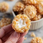 Delight in these Marshmallow Caramel Rice Krispies Puffs, a nostalgic treat combining soft marshmallows dipped in a rich caramel mixture and coated with crispy rice cereal for the perfect sweet and crunchy bite-sized snack.