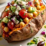 This Mediterranean Stuffed Sweet Potatoes recipe combines roasted sweet potatoes with a fresh, tangy filling of chickpeas, cherry tomatoes, cucumber, olives, and feta cheese, dressed in a flavorful olive oil and lemon dressing. It’s a wholesome and vibrant main course perfect for a healthy, satisfying meal.