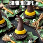 This Melted Witch Halloween Bark Recipe combines whimsical witch hat cookies, broomstick decorations, and colorful chocolate swirls on festive bark, perfect for a spooky Halloween treat. It features milk and dark chocolate with fun candy accents like fondant, pretzels, and candy eyeballs for a playful and delicious dessert.