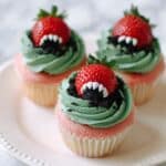 For Halloween parties or kid’s birthday celebrations, I’ve arranged these Monster Strawberry Cupcakes on a dessert tray surrounded by candied “eyeballs” and green gummy worms for extra spook factor. Wrapping them individually in clear boxes tied with green ribbons is a hit when giving them as gifts, too!