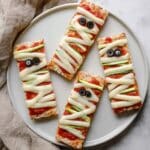 For Halloween parties, I’ve arranged several mummy pizzas on a large platter with little plastic spiders scattered for fun, or served mini versions as individual finger foods that kids can hold. Wrapping the handle area in parchment paper also makes them look like tiny scrolls and easy to grab.