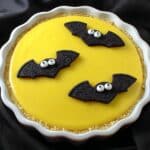 Now for the fun part! Carefully unwrap the miniature Reese’s peanut butter cups, and break the Oreo Thins in half and remove the creamy filling. These halves become bat wings. Affix two wings (one on each side) to each Reese’s cup with a dab of royal icing acting like glue. Press edible eyes onto the top center of each peanut butter cup with more icing. The bats add a perfect cute-but-creepy Halloween vibe. I’ve learned to add the bats right before serving because the frosting eyes can start to slide if stored too long on the pie.