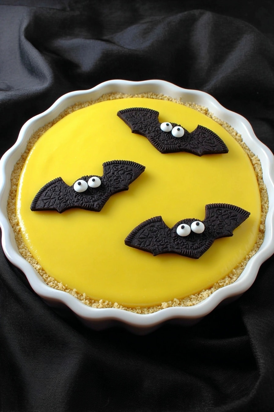 I like to finish off this pie with a light dusting of cocoa powder or edible glitter to make the bats pop. You could also sprinkle crushed candy corn or mini chocolate chips around the edges for extra color and texture. For a truly festive pumpkin patch vibe, add a few candied pumpkin seeds or small Halloween sprinkles—it’s more playful than over-the-top.