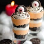- Assemble the parfait: Transfer the white and orange cheesecake batters into separate piping bags. Remove the frozen glasses from the freezer and pipe orange cheesecake batter over the Oreo base. Follow with a layer of white cheesecake batter, then sprinkle some reserved Oreo crumbs on top. Repeat the layering process, ending with a white cheesecake batter layer. Garnish with additional crushed Oreos and the prepared spooky eyes for decoration.