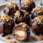 - Dip balls in chocolate: Working quickly, dip each frozen cheesecake ball into the melted chocolate using a fork or dipping tool, allowing excess to drip off before placing back on clean parchment paper.