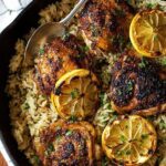 A flavorful one pot Greek chicken and lemon rice dish featuring tender bone-in, skin-on chicken thighs marinated with lemon, garlic, and oregano, cooked together with aromatic rice for a deliciously comforting meal.