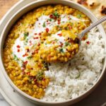 For special dinners, I like to serve the dahl in individual rustic bowls, layered with rice on the bottom, dahl ladled on top, and finished with a swirl of coconut yogurt and bright garnishes. Adding edible flowers or sprigs of fresh herbs makes it feel extra festive and inviting.